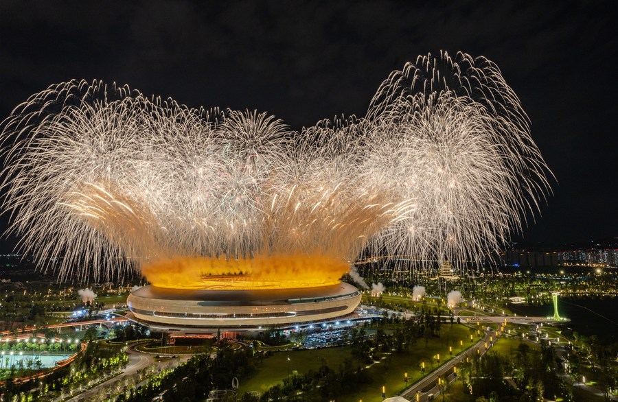 Fireworks are seen during the opening ceremony of the 31st FISU Summer World University Games in Chengdu, southwest China's Sichuan Province, July 28, 2023. (Xinhua/Jiang Hongjing)