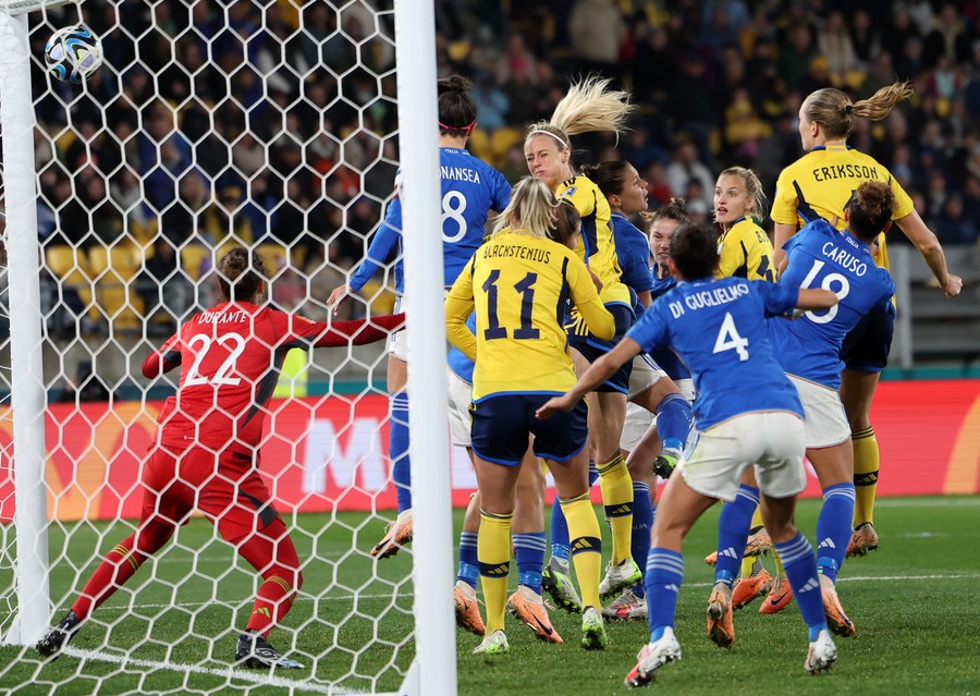 Amanda Ilestedt (4th L) of Sweden scores her header in the group G match against Italy at the 2023 FIFA Women's World Cup in Wellington, New Zealand, July 29, 2023. (Xinhua/Qin Lang)
