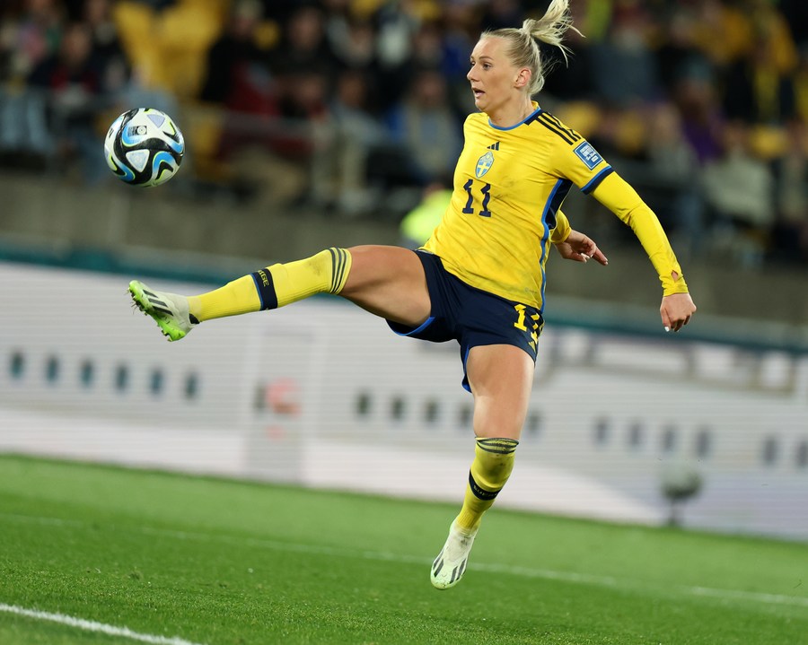 Stina Blackstenius of Sweden stops the ball during the match. (Xinhua/Qin Lang)