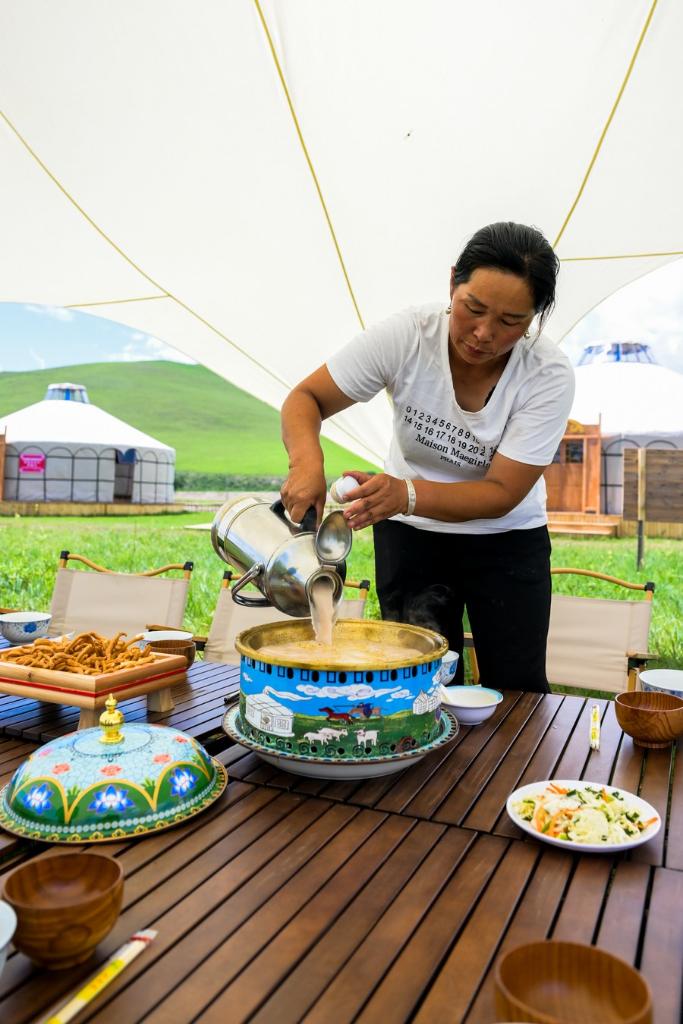 Bai Saran, wife of Uu Sodo, prepares milk tea for tourists in Horqin Right Wing Front Banner, Hinggan League, north China's Inner Mongolia Autonomous Region, July 25, 2023. (Xinhua/Li Zhipeng)