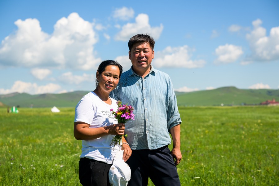 Uu Sodo and his wife Bai Saran pose for a photo in Horqin Right Wing Front Banner, Hinggan League, north China's Inner Mongolia Autonomous Region, July 25, 2023. (Xinhua/Li Zhipeng)