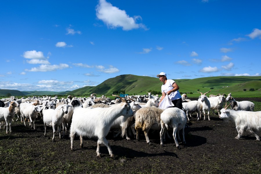Bai Saran, wife of Uu Sodo, feeds salt to sheep in Horqin Right Wing Front Banner, Hinggan League, north China's Inner Mongolia Autonomous Region, July 24, 2023. (Xinhua/Li Zhipeng)