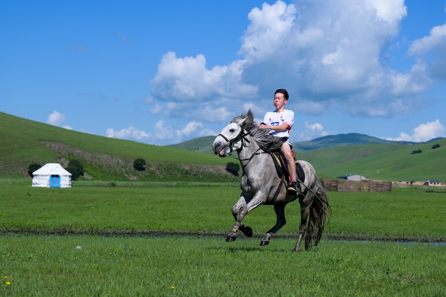 Uu Surleg, son of Uu Sodo, rides a horse in Horqin Right Wing Front Banner, Hinggan League, north China's Inner Mongolia Autonomous Region, July 25, 2023. (Xinhua/Li Zhipeng)