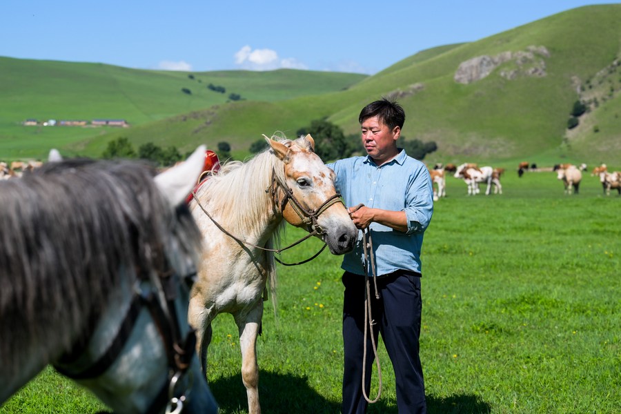 Uu Sodo strokes a horse in Horqin Right Wing Front Banner, Hinggan League, north China's Inner Mongolia Autonomous Region, July 25, 2023. (Xinhua/Li Zhipeng)
