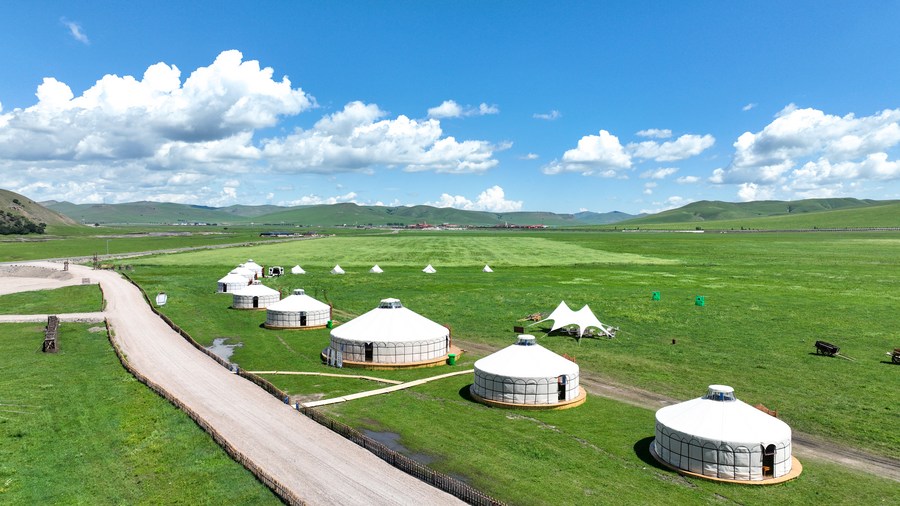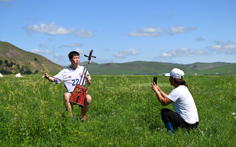 HINGGAN LEAGUE, July 30 (Xinhua) -- Uu Sodo, a herdsman, and his family reside in a village on the Ulan Mod grassland, located in Horqin Right Wing Front Banner, Hinggan League of north China's Inner Mongolia Autonomous Region. Earlier this year, Uu Sodo established a "herdsman house hostel", offering guests the opportunity to try horse riding, archery, savor milk tea and mutton, and appreciate the stunning Ulan Mod landscapes. His son, Uu Surleg, joined him during the summer, serving food, guiding horses, and playing the Morin Khuur, a traditional Mongolian bowed string instrument featuring a horse-head carving at its top, for visitors.