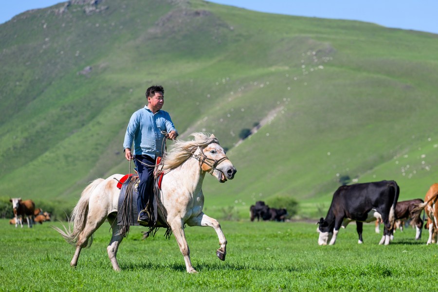 Uu Sodo rides a horse on the Ulan Mod grassland in Horqin Right Wing Front Banner, Hinggan League, north China's Inner Mongolia Autonomous Region, July 25, 2023. (Xinhua/Li Zhipeng)