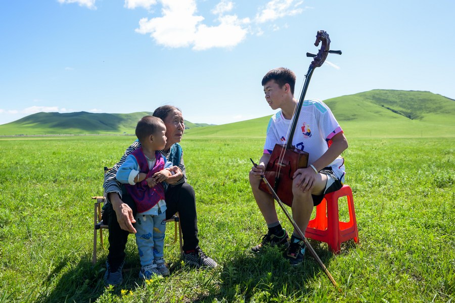 Bai Saran, wife of Uu Sodo, takes photos of her son Uu Surleg while he is playing the Morin Khuur, in Horqin Right Wing Front Banner, Hinggan League, north China's Inner Mongolia Autonomous Region, July 24, 2023. (Xinhua/Bei He)