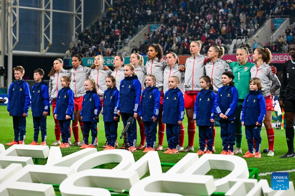 Players of Switzerland line up before the group A match between Switzerland and New Zealand at the 2023 FIFA Women's World Cup in Dunedin, New Zealand, July 30, 2023. (Xinhua/Zhu Wei)