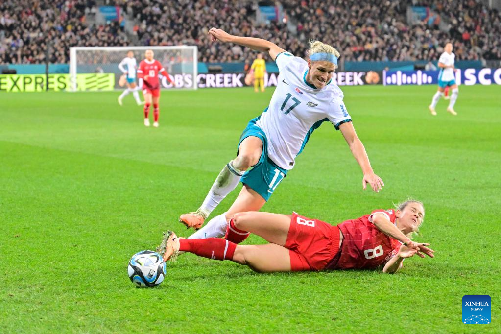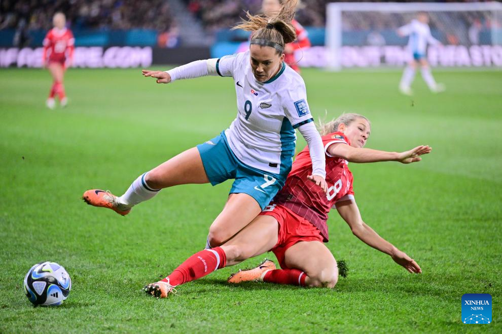 Nadine Riesen (R) of Switzerland vies with Gabi Rennie of New Zealand during the group A match at the 2023 FIFA Women's World Cup in Dunedin, New Zealand, July 30, 2023. (Xinhua/Zhu Wei)