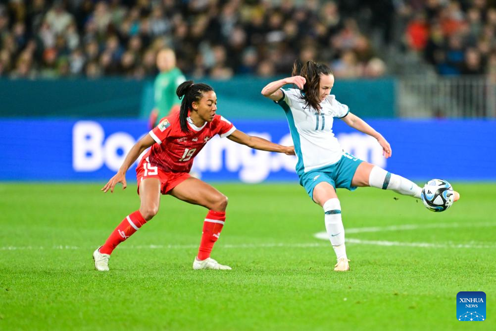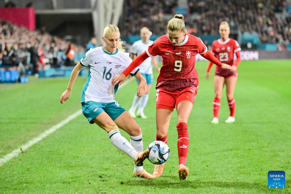 Nadine Riesen (R) of Switzerland vies with Hannah Wilkinson of New Zealand during the group A match at the 2023 FIFA Women's World Cup in Dunedin, New Zealand, July 30, 2023. (Xinhua/Zhu Wei)