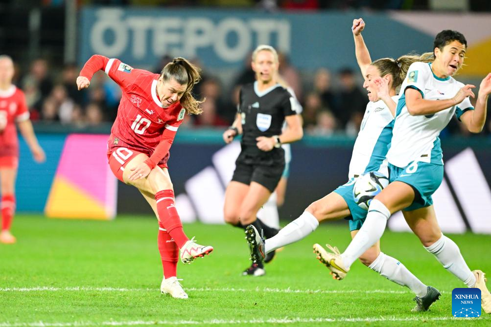 Ramona Bachmann (L) of Switzerland shoots the ball during the group A match between Switzerland and New Zealand at the 2023 FIFA Women's World Cup in Dunedin, New Zealand, July 30, 2023. (Xinhua/Zhu Wei)
