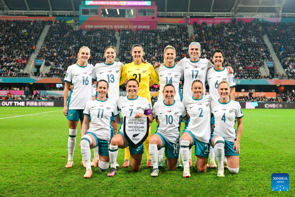 Players of New Zealand pose for a group photo before the group A match between Switzerland and New Zealand at the 2023 FIFA Women's World Cup in Dunedin, New Zealand, July 30, 2023. (Xinhua/Zhu Wei)