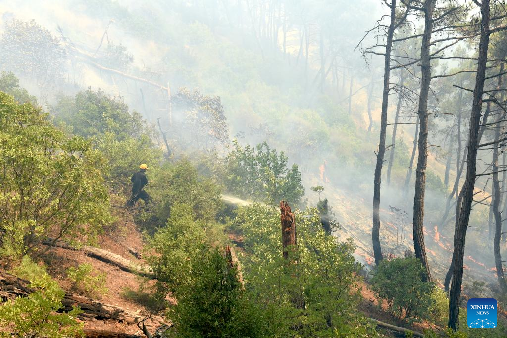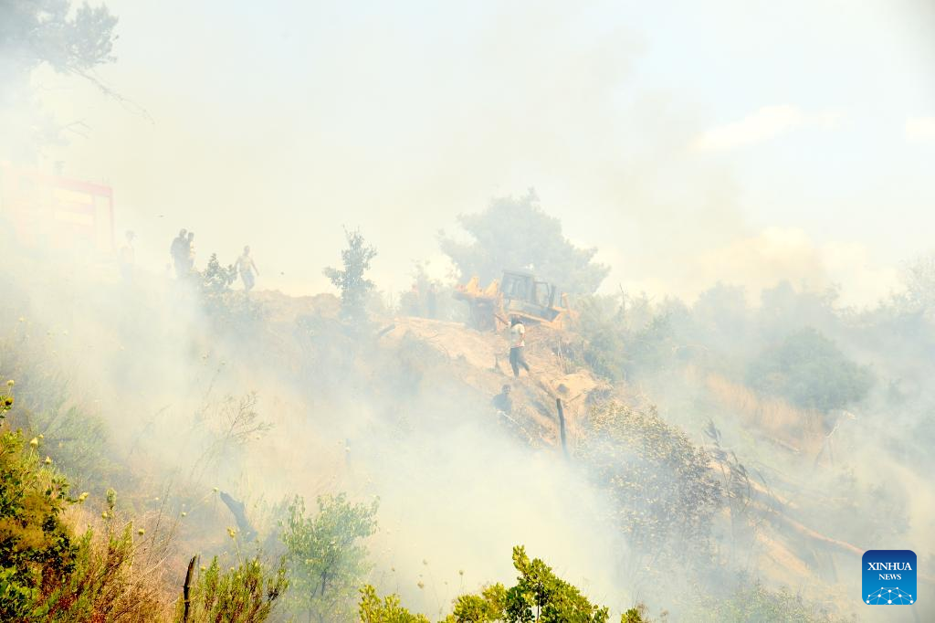 Firefighters work to extinguish a mountain fire in Latakia province, northwestern Syria, July 29, 2023. Earlier this month, massive wildfires broke out in several Syrian provinces, including Hama, Latakia and Idlib. Firefighters managed to control most of the fires but in Latakia, fires restarted on Tuesday. Fire crews have been battling numerous blazes in the region. (Photo by Monsef Memari/Xinhua)