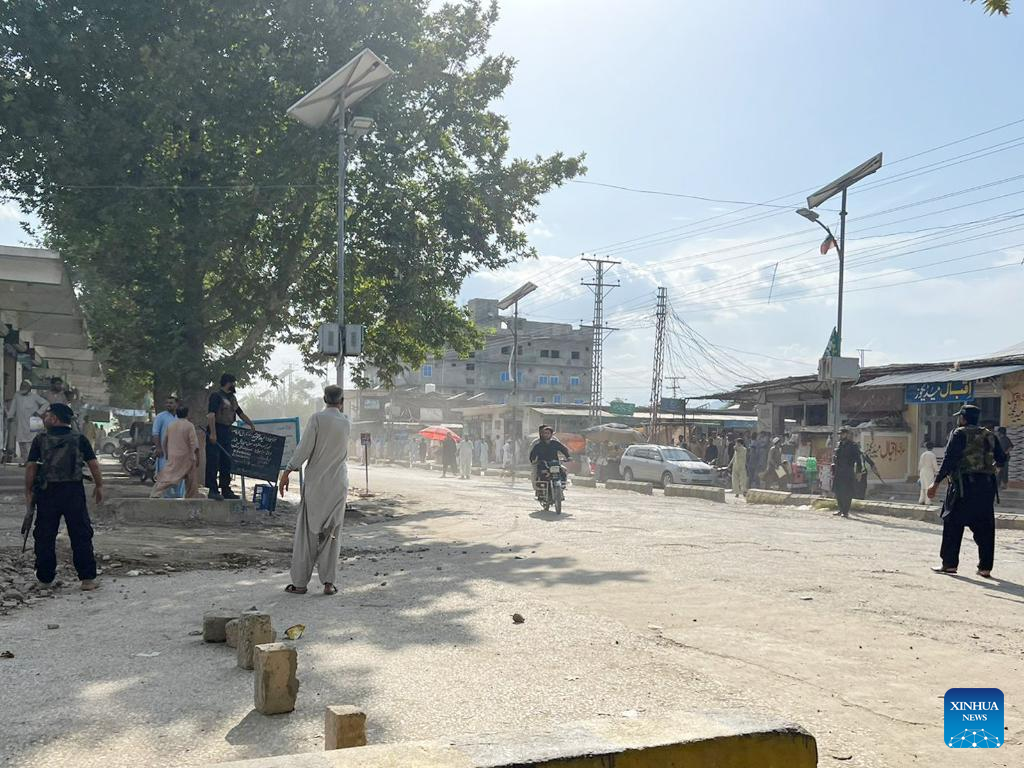 This photo taken with a mobile phone shows security personnel standing guard near the blast site in Pakistan's northwest Bajaur district on July 30, 2023. A bomb blast hit a political rally on Sunday afternoon in Pakistan's northwest Bajaur district, leaving at least 10 people dead and over 50 others injured, a rescue official told Xinhua. (Str/Xinhua)