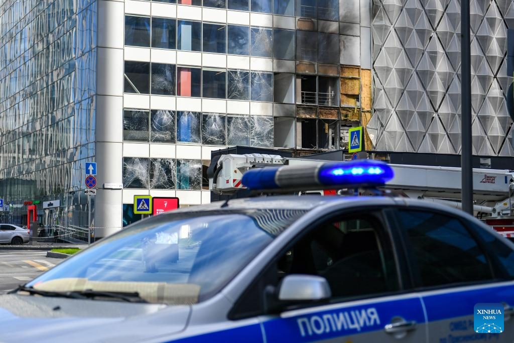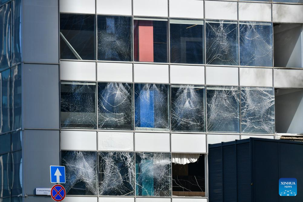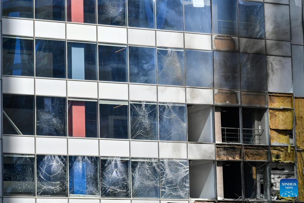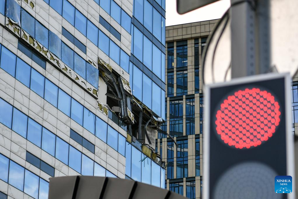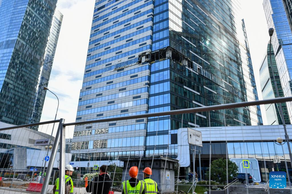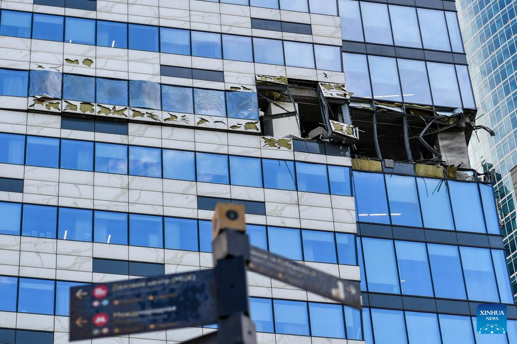 This photo taken on July 30, 2023 shows a building damaged in a drone attack in Moscow, Russia. Ukraine attempted to launch an attack on targets in Moscow with three drones but failed to achieve its goal, said the Russian Defense Ministry on Sunday. According to the ministry, Kiev launched three unmanned aerial vehicles at Moscow early morning on Sunday. One was shot down by air defense forces over the Odintsovo district in the Moscow region, while the other two were jammed by electronic warfare systems and crashed onto a complex of non-residential buildings in Moscow. (Xinhua/Cao Yang)