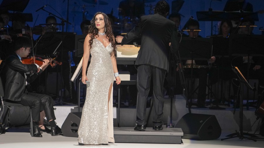 Italian opera singer Chiara Di Bari (front) performs in the Shaanxi Opera House in Xi'an, northwest China's Shaanxi Province, July 21, 2023. (Shaanxi Opera House/Handout via Xinhua)