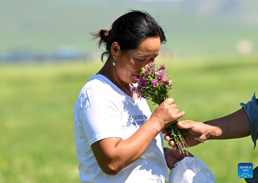 Bai Saran smells a bunch of flowers picked by her husband Uu Sodo in Horqin Right Wing Front Banner, Hinggan League, north China's Inner Mongolia Autonomous Region, July 25, 2023. Uu Sodo, a herdsman, and his family reside in a village on the Ulan Mod grassland, located in Horqin Right Wing Front Banner, Hinggan League of north China's Inner Mongolia Autonomous Region. Earlier this year, Uu Sodo established a "herdsman house hostel", offering guests the opportunity to try horse riding, archery, savor milk tea and mutton, and appreciate the stunning Ulan Mod landscapes. His son, Uu Surleg, joined him during the summer, serving food, guiding horses, and playing the Morin Khuur, a traditional Mongolian bowed string instrument featuring a horse-head carving at its top, for visitors.