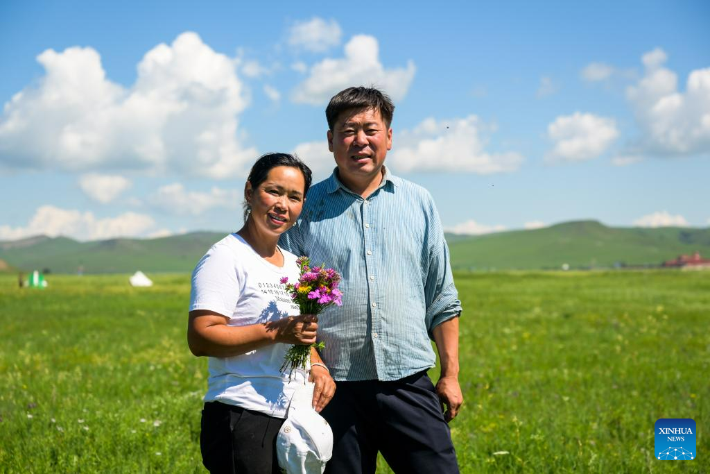 Uu Sodo and his wife Bai Saran pose for a photo in Horqin Right Wing Front Banner, Hinggan League, north China's Inner Mongolia Autonomous Region, July 25, 2023. Uu Sodo, a herdsman, and his family reside in a village on the Ulan Mod grassland, located in Horqin Right Wing Front Banner, Hinggan League of north China's Inner Mongolia Autonomous Region. Earlier this year, Uu Sodo established a "herdsman house hostel", offering guests the opportunity to try horse riding, archery, savor milk tea and mutton, and appreciate the stunning Ulan Mod landscapes. His son, Uu Surleg, joined him during the summer, serving food, guiding horses, and playing the Morin Khuur, a traditional Mongolian bowed string instrument featuring a horse-head carving at its top, for visitors.