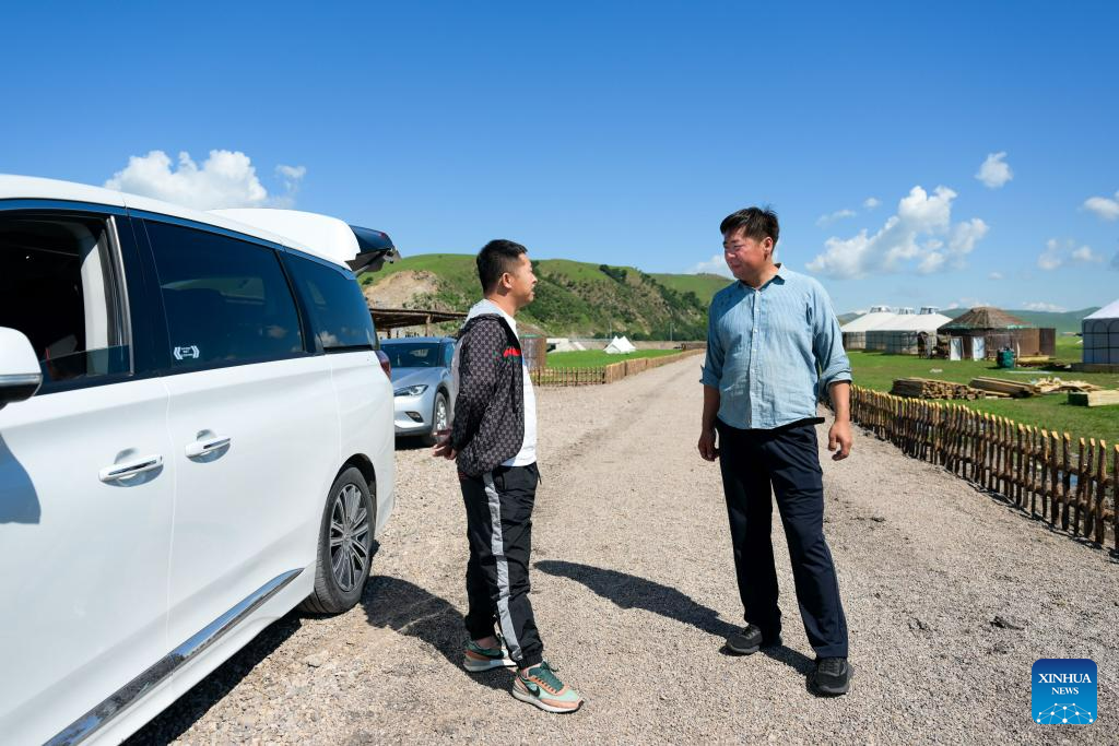Uu Sodo (R) talks with a tourist in Horqin Right Wing Front Banner, Hinggan League, north China's Inner Mongolia Autonomous Region, July 25, 2023. Uu Sodo, a herdsman, and his family reside in a village on the Ulan Mod grassland, located in Horqin Right Wing Front Banner, Hinggan League of north China's Inner Mongolia Autonomous Region. Earlier this year, Uu Sodo established a "herdsman house hostel", offering guests the opportunity to try horse riding, archery, savor milk tea and mutton, and appreciate the stunning Ulan Mod landscapes. His son, Uu Surleg, joined him during the summer, serving food, guiding horses, and playing the Morin Khuur, a traditional Mongolian bowed string instrument featuring a horse-head carving at its top, for visitors.