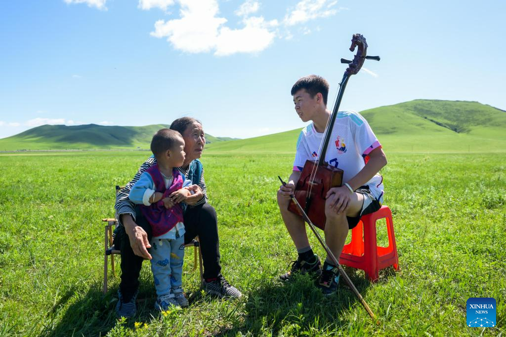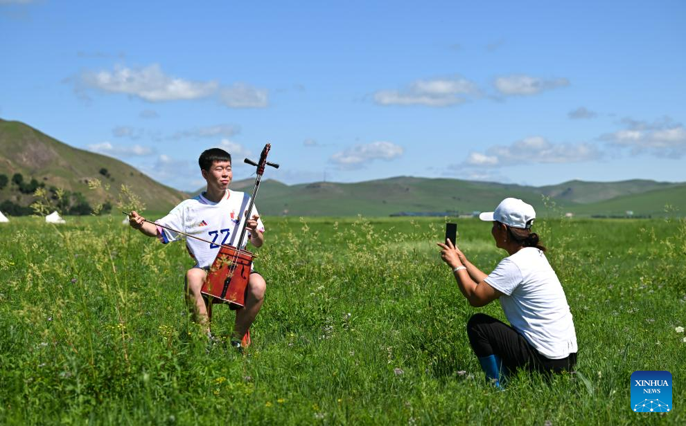 Bai Saran, wife of Uu Sodo, takes photos of her son Uu Surleg while he is playing the Morin Khuur, in Horqin Right Wing Front Banner, Hinggan League, north China's Inner Mongolia Autonomous Region, July 24, 2023. Uu Sodo, a herdsman, and his family reside in a village on the Ulan Mod grassland, located in Horqin Right Wing Front Banner, Hinggan League of north China's Inner Mongolia Autonomous Region. Earlier this year, Uu Sodo established a "herdsman house hostel", offering guests the opportunity to try horse riding, archery, savor milk tea and mutton, and appreciate the stunning Ulan Mod landscapes. His son, Uu Surleg, joined him during the summer, serving food, guiding horses, and playing the Morin Khuur, a traditional Mongolian bowed string instrument featuring a horse-head carving at its top, for visitors.