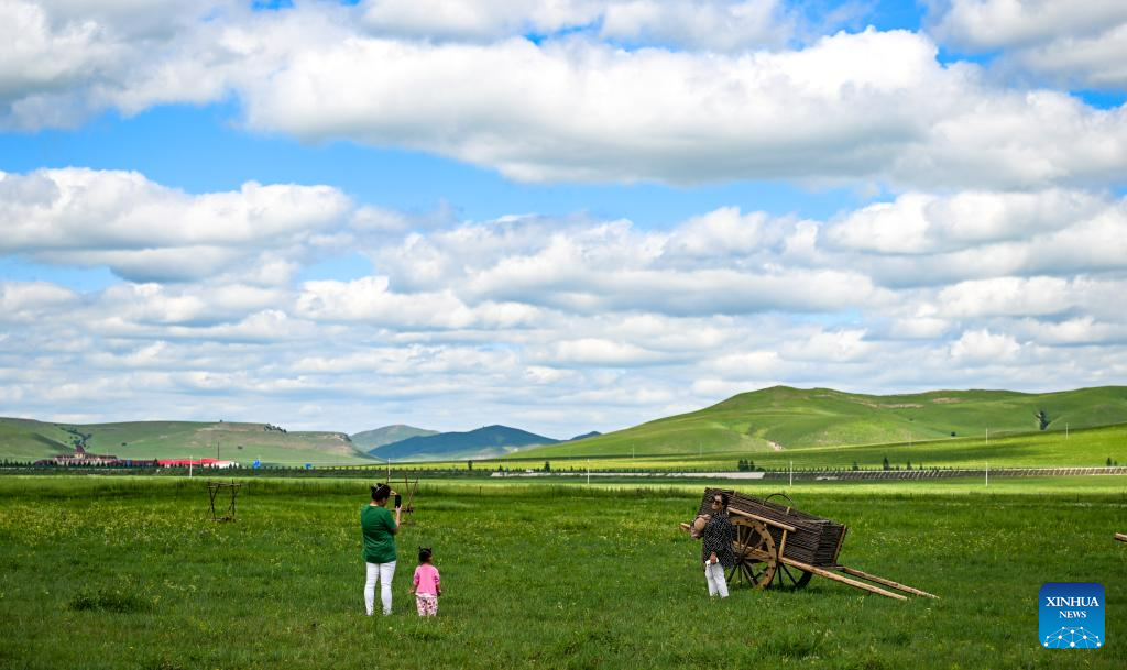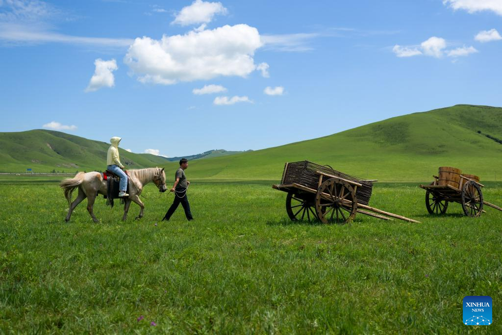 This photo taken on July 24, 2023 shows the scenery of Ulan Mod grassland in Horqin Right Wing Front Banner, Hinggan League, north China's Inner Mongolia Autonomous Region. Uu Sodo, a herdsman, and his family reside in a village on the Ulan Mod grassland, located in Horqin Right Wing Front Banner, Hinggan League of north China's Inner Mongolia Autonomous Region. Earlier this year, Uu Sodo established a "herdsman house hostel", offering guests the opportunity to try horse riding, archery, savor milk tea and mutton, and appreciate the stunning Ulan Mod landscapes. His son, Uu Surleg, joined him during the summer, serving food, guiding horses, and playing the Morin Khuur, a traditional Mongolian bowed string instrument featuring a horse-head carving at its top, for visitors.