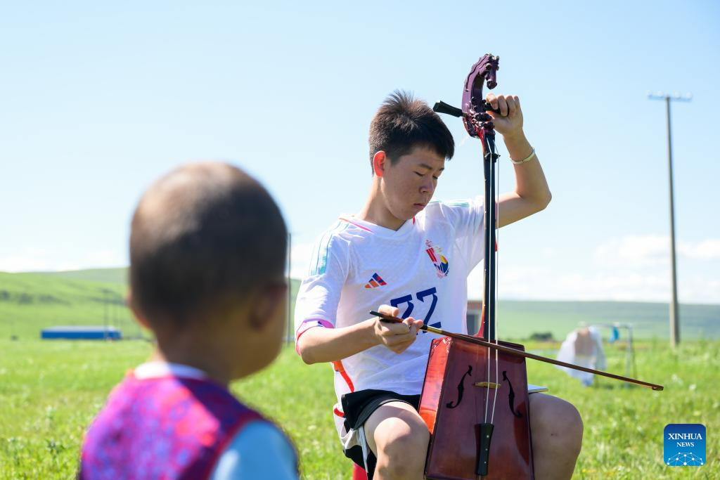 Uu Surleg, son of Uu Sodo, prepares to play the Morin Khuur, in Horqin Right Wing Front Banner, Hinggan League, north China's Inner Mongolia Autonomous Region, July 24, 2023. Uu Sodo, a herdsman, and his family reside in a village on the Ulan Mod grassland, located in Horqin Right Wing Front Banner, Hinggan League of north China's Inner Mongolia Autonomous Region. Earlier this year, Uu Sodo established a "herdsman house hostel", offering guests the opportunity to try horse riding, archery, savor milk tea and mutton, and appreciate the stunning Ulan Mod landscapes. His son, Uu Surleg, joined him during the summer, serving food, guiding horses, and playing the Morin Khuur, a traditional Mongolian bowed string instrument featuring a horse-head carving at its top, for visitors.