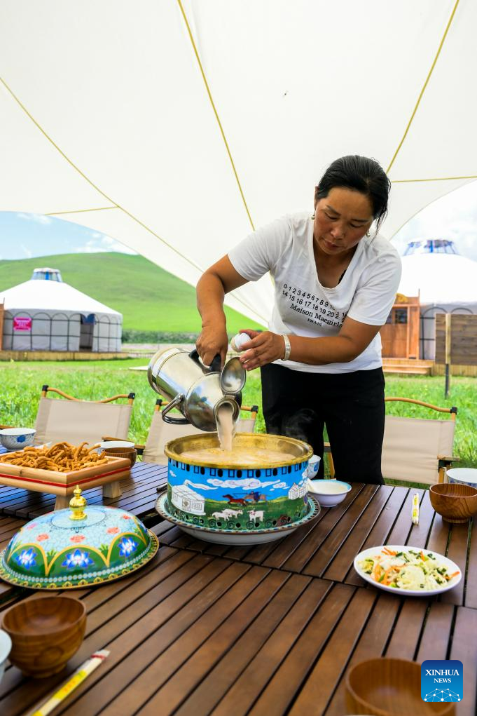 Bai Saran, wife of Uu Sodo, prepares milk tea for tourists in Horqin Right Wing Front Banner, Hinggan League, north China's Inner Mongolia Autonomous Region, July 25, 2023. Uu Sodo, a herdsman, and his family reside in a village on the Ulan Mod grassland, located in Horqin Right Wing Front Banner, Hinggan League of north China's Inner Mongolia Autonomous Region. Earlier this year, Uu Sodo established a "herdsman house hostel", offering guests the opportunity to try horse riding, archery, savor milk tea and mutton, and appreciate the stunning Ulan Mod landscapes. His son, Uu Surleg, joined him during the summer, serving food, guiding horses, and playing the Morin Khuur, a traditional Mongolian bowed string instrument featuring a horse-head carving at its top, for visitors.