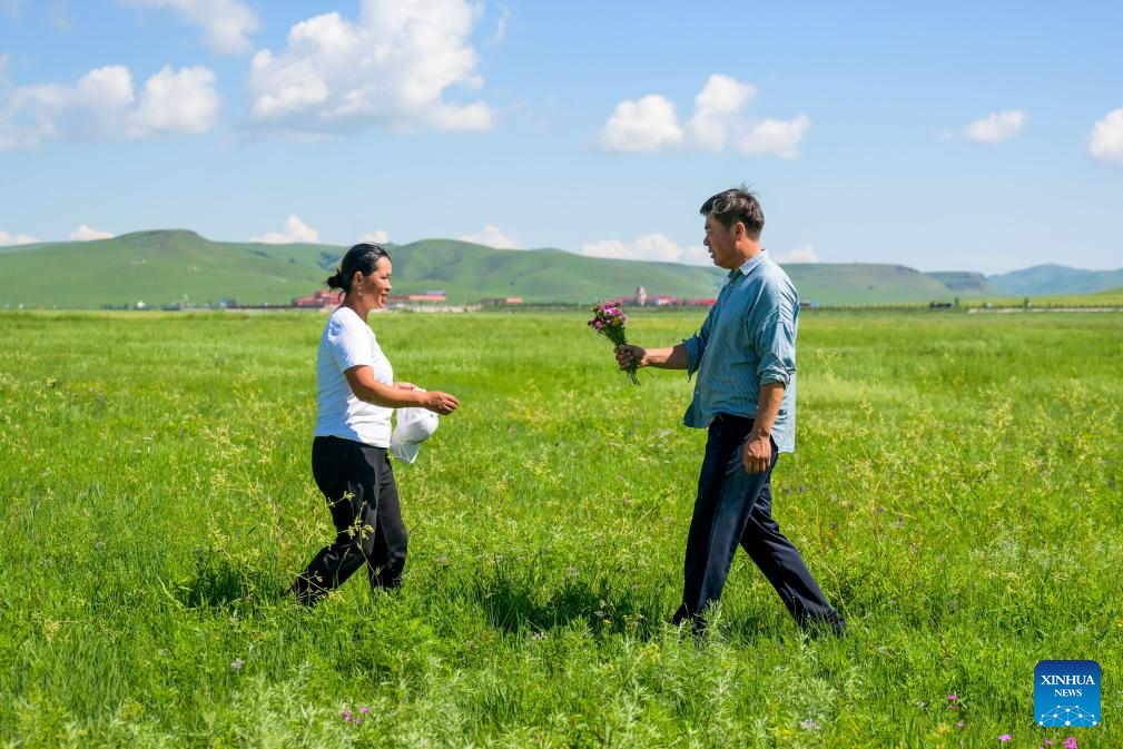 Uu Sodo picks a bunch of flowers for his wife Bai Saran in Horqin Right Wing Front Banner, Hinggan League, north China's Inner Mongolia Autonomous Region, July 25, 2023. Uu Sodo, a herdsman, and his family reside in a village on the Ulan Mod grassland, located in Horqin Right Wing Front Banner, Hinggan League of north China's Inner Mongolia Autonomous Region. Earlier this year, Uu Sodo established a "herdsman house hostel", offering guests the opportunity to try horse riding, archery, savor milk tea and mutton, and appreciate the stunning Ulan Mod landscapes. His son, Uu Surleg, joined him during the summer, serving food, guiding horses, and playing the Morin Khuur, a traditional Mongolian bowed string instrument featuring a horse-head carving at its top, for visitors.