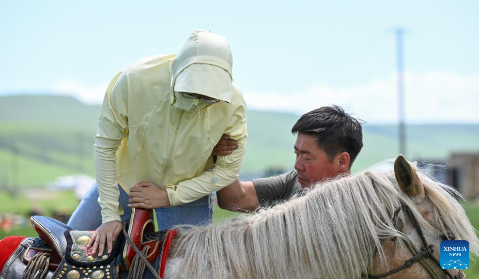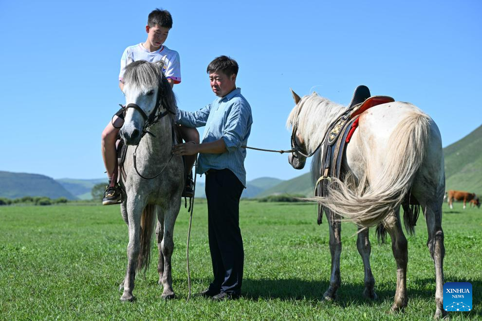 A tourist rides a horse with the help of Uu Sodo, in Horqin Right Wing Front Banner, Hinggan League, north China's Inner Mongolia Autonomous Region, July 25, 2023. Uu Sodo, a herdsman, and his family reside in a village on the Ulan Mod grassland, located in Horqin Right Wing Front Banner, Hinggan League of north China's Inner Mongolia Autonomous Region. Earlier this year, Uu Sodo established a "herdsman house hostel", offering guests the opportunity to try horse riding, archery, savor milk tea and mutton, and appreciate the stunning Ulan Mod landscapes. His son, Uu Surleg, joined him during the summer, serving food, guiding horses, and playing the Morin Khuur, a traditional Mongolian bowed string instrument featuring a horse-head carving at its top, for visitors.
