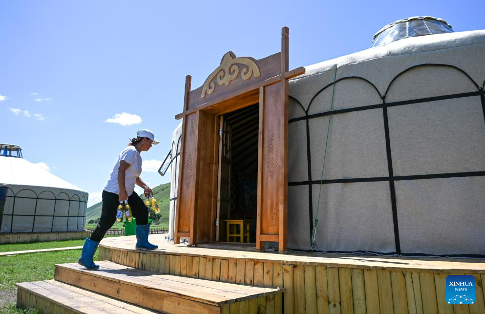 Bai Saran, wife of Uu Sodo, takes a beverage for tourists in Horqin Right Wing Front Banner, Hinggan League, north China's Inner Mongolia Autonomous Region, July 24, 2023. Uu Sodo, a herdsman, and his family reside in a village on the Ulan Mod grassland, located in Horqin Right Wing Front Banner, Hinggan League of north China's Inner Mongolia Autonomous Region. Earlier this year, Uu Sodo established a "herdsman house hostel", offering guests the opportunity to try horse riding, archery, savor milk tea and mutton, and appreciate the stunning Ulan Mod landscapes. His son, Uu Surleg, joined him during the summer, serving food, guiding horses, and playing the Morin Khuur, a traditional Mongolian bowed string instrument featuring a horse-head carving at its top, for visitors.