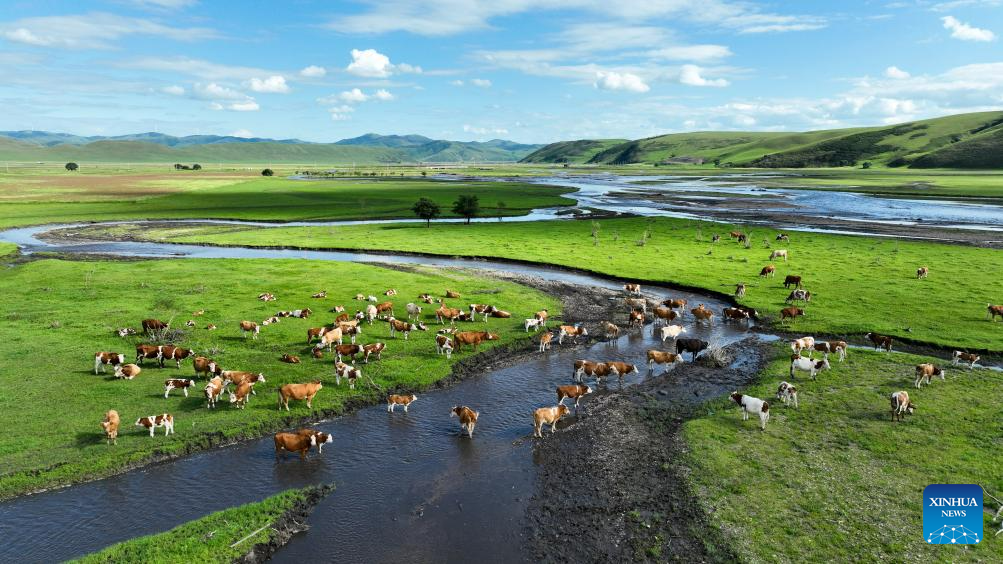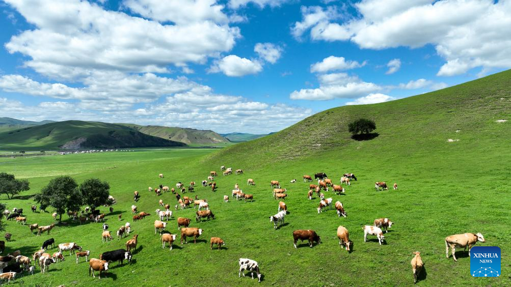 This aerial photo taken on July 24, 2023 shows a herd of cattle on the Ulan Mod grassland, in Horqin Right Wing Front Banner, Hinggan League, north China's Inner Mongolia Autonomous Region. Uu Sodo, a herdsman, and his family reside in a village on the Ulan Mod grassland, located in Horqin Right Wing Front Banner, Hinggan League of north China's Inner Mongolia Autonomous Region. Earlier this year, Uu Sodo established a "herdsman house hostel", offering guests the opportunity to try horse riding, archery, savor milk tea and mutton, and appreciate the stunning Ulan Mod landscapes. His son, Uu Surleg, joined him during the summer, serving food, guiding horses, and playing the Morin Khuur, a traditional Mongolian bowed string instrument featuring a horse-head carving at its top, for visitors.
