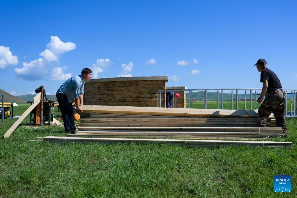 Uu Sodo works to build an outdoor dining room at his "herdsman house hostel" in Horqin Right Wing Front Banner, Hinggan League, north China's Inner Mongolia Autonomous Region, July 25, 2023. Uu Sodo, a herdsman, and his family reside in a village on the Ulan Mod grassland, located in Horqin Right Wing Front Banner, Hinggan League of north China's Inner Mongolia Autonomous Region. Earlier this year, Uu Sodo established a "herdsman house hostel", offering guests the opportunity to try horse riding, archery, savor milk tea and mutton, and appreciate the stunning Ulan Mod landscapes. His son, Uu Surleg, joined him during the summer, serving food, guiding horses, and playing the Morin Khuur, a traditional Mongolian bowed string instrument featuring a horse-head carving at its top, for visitors.