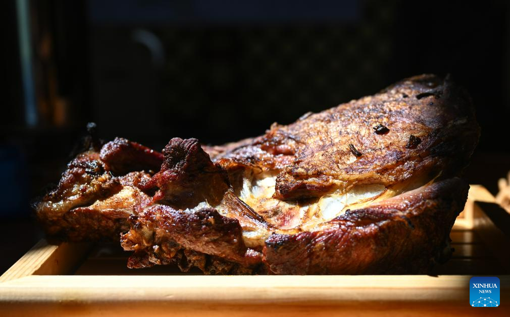 This photo taken on July 24, 2023 shows roasted lamb chop served by Uu Sodo's "herdsman house hostel" in Horqin Right Wing Front Banner, Hinggan League, north China's Inner Mongolia Autonomous Region. Uu Sodo, a herdsman, and his family reside in a village on the Ulan Mod grassland, located in Horqin Right Wing Front Banner, Hinggan League of north China's Inner Mongolia Autonomous Region. Earlier this year, Uu Sodo established a "herdsman house hostel", offering guests the opportunity to try horse riding, archery, savor milk tea and mutton, and appreciate the stunning Ulan Mod landscapes. His son, Uu Surleg, joined him during the summer, serving food, guiding horses, and playing the Morin Khuur, a traditional Mongolian bowed string instrument featuring a horse-head carving at its top, for visitors.
