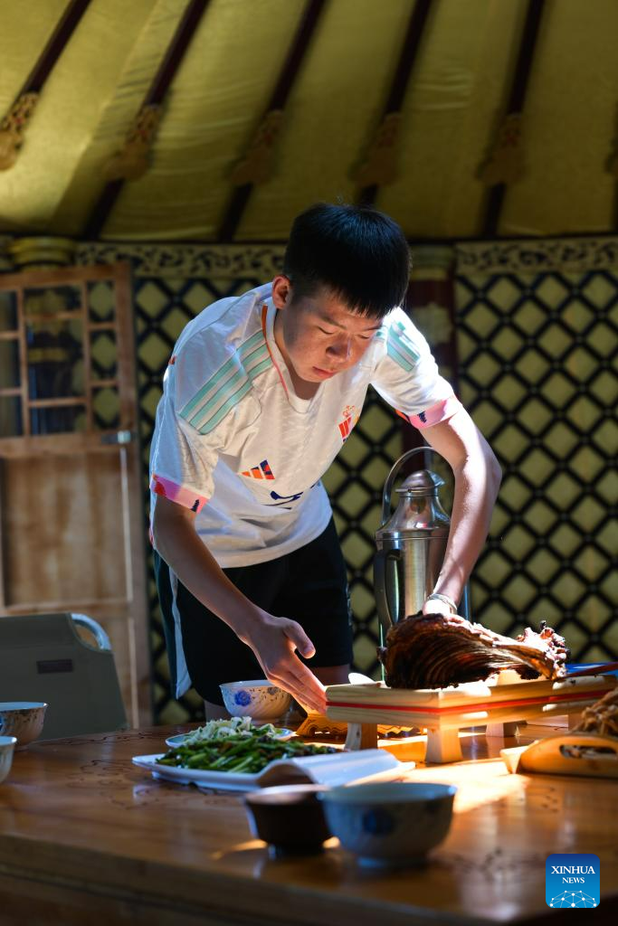 Uu Surleg, son of Uu Sodo, serves a dish for tourists in Horqin Right Wing Front Banner, Hinggan League, north China's Inner Mongolia Autonomous Region, July 24, 2023. Uu Sodo, a herdsman, and his family reside in a village on the Ulan Mod grassland, located in Horqin Right Wing Front Banner, Hinggan League of north China's Inner Mongolia Autonomous Region. Earlier this year, Uu Sodo established a "herdsman house hostel", offering guests the opportunity to try horse riding, archery, savor milk tea and mutton, and appreciate the stunning Ulan Mod landscapes. His son, Uu Surleg, joined him during the summer, serving food, guiding horses, and playing the Morin Khuur, a traditional Mongolian bowed string instrument featuring a horse-head carving at its top, for visitors.