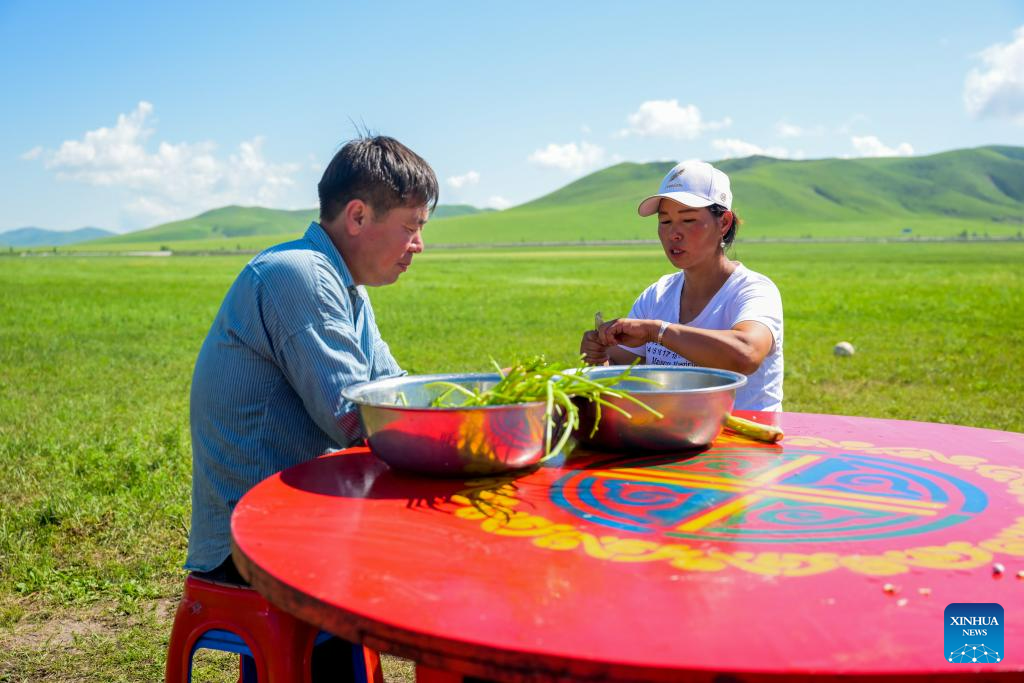 Uu Sodo(L) and his wife Bai Saran prepare food in Horqin Right Wing Front Banner, Hinggan League, north China's Inner Mongolia Autonomous Region, July 25, 2023. Uu Sodo, a herdsman, and his family reside in a village on the Ulan Mod grassland, located in Horqin Right Wing Front Banner, Hinggan League of north China's Inner Mongolia Autonomous Region. Earlier this year, Uu Sodo established a "herdsman house hostel", offering guests the opportunity to try horse riding, archery, savor milk tea and mutton, and appreciate the stunning Ulan Mod landscapes. His son, Uu Surleg, joined him during the summer, serving food, guiding horses, and playing the Morin Khuur, a traditional Mongolian bowed string instrument featuring a horse-head carving at its top, for visitors.