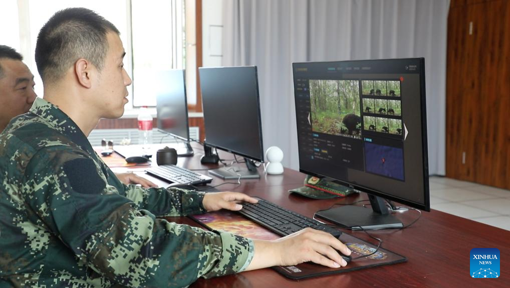 Ranger Zang Peng (R) checks images taken by infrared cameras at the Suiyang bureau branch of park administration of the Northeast China Tiger and Leopard National Park in northeast China's Heilongjiang Province, July 26, 2023. (Xinhua/Dai Jinrong)