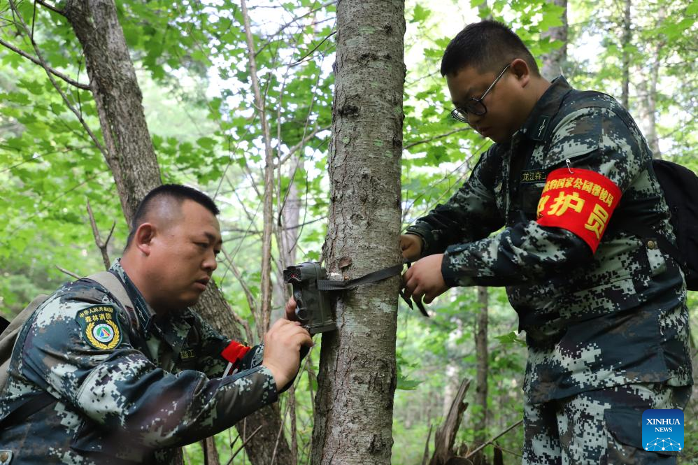 Rangers install an infrared camera in the Northeast China Tiger and Leopard National Park in northeast China's Heilongjiang Province, July 25, 2023. (Xinhua/Dai Jinrong)