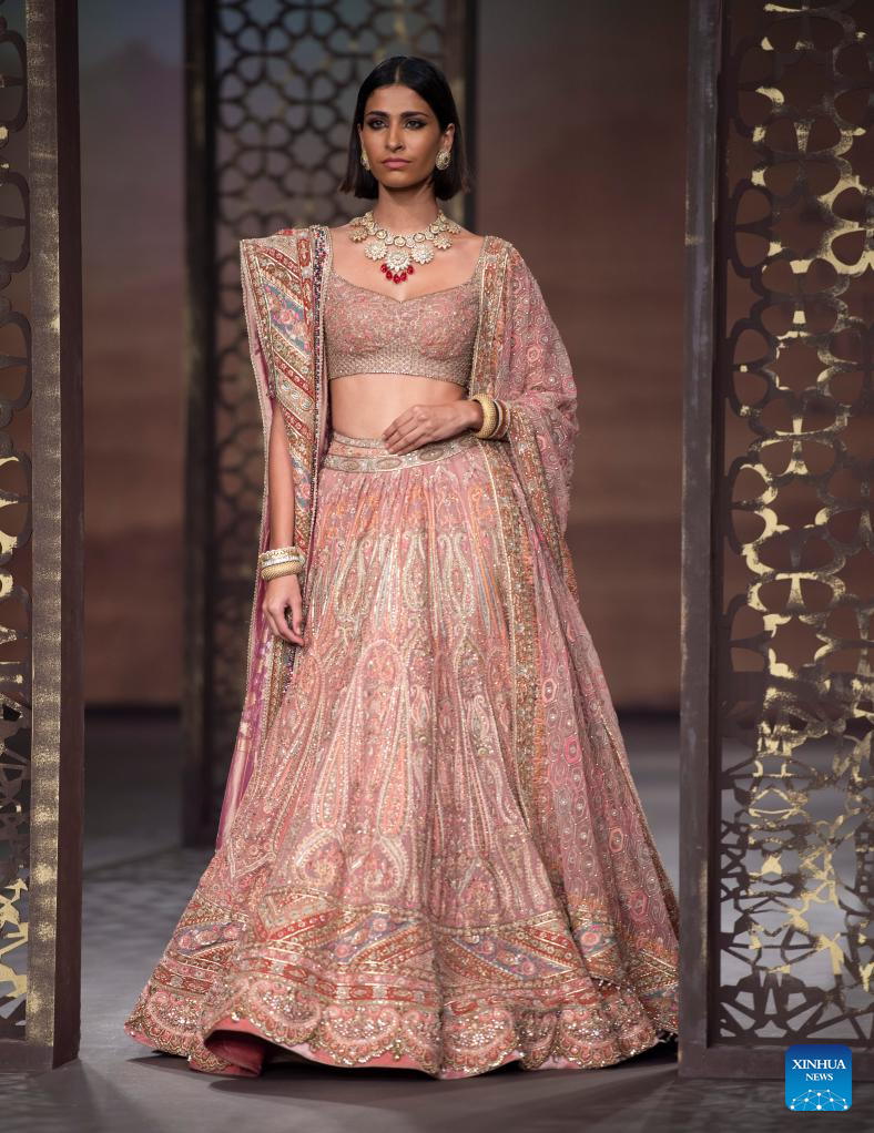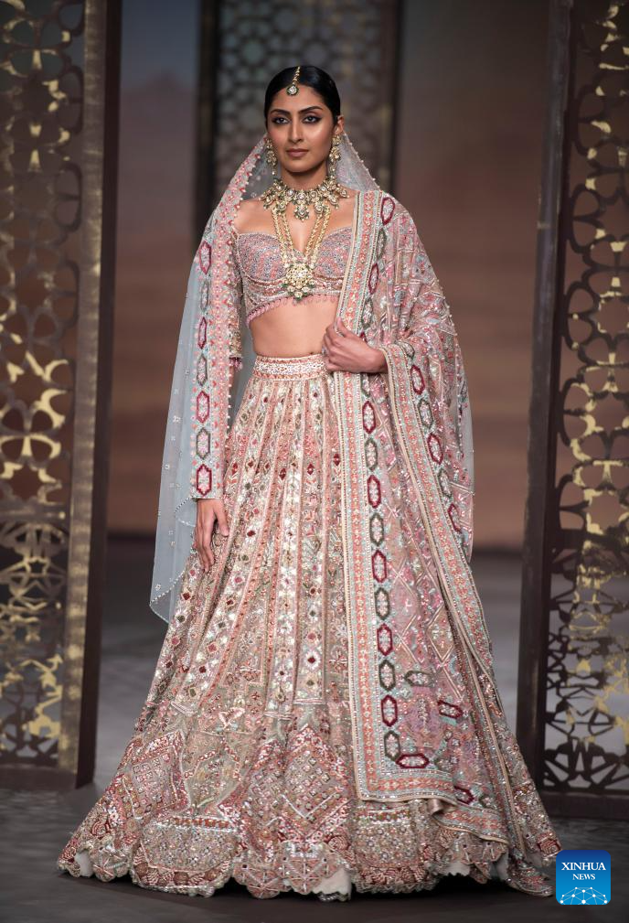 A model displays a creation by Indian designer Tarun Tahiliani during the FDCI India Couture Week 2023 in New Delhi, July 29, 2023. (Xinhua/Javed Dar)