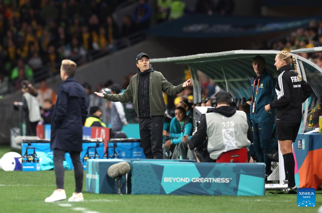 Head coach Tony Gustavsson of Australia reacts after receiving a yellow card during the Group B match between Canada and Australia at the 2023 FIFA Women's World Cup in Melbourne, Australia, July 31, 2023. (Xinhua/Ding Xu)