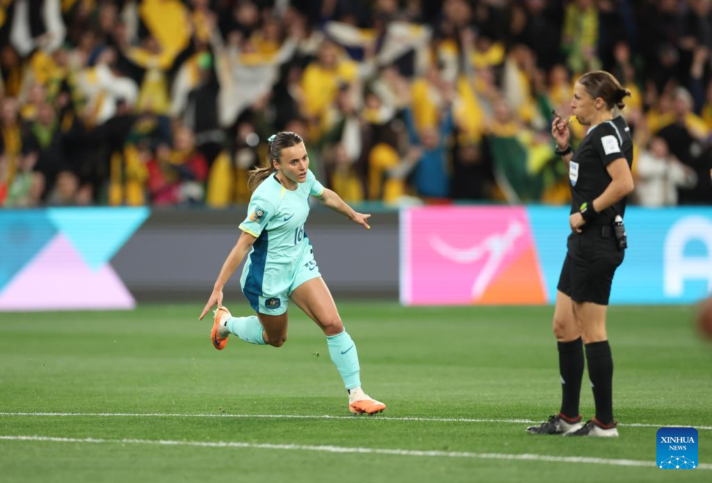 Australia's Steph Catley (1st R) celebrates scoring the team's fourth goal during the Group B match between Canada and Australia at the 2023 FIFA Women's World Cup in Melbourne, Australia, July 31, 2023. (Xinhua/Ding Xu)
