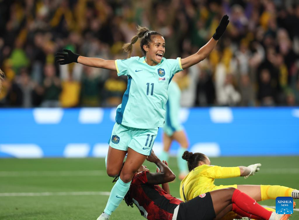 Australia's Mary Fowler celebrates during the Group B match between Canada and Australia at the 2023 FIFA Women's World Cup in Melbourne, Australia, July 31, 2023. (Xinhua/Ding Xu)