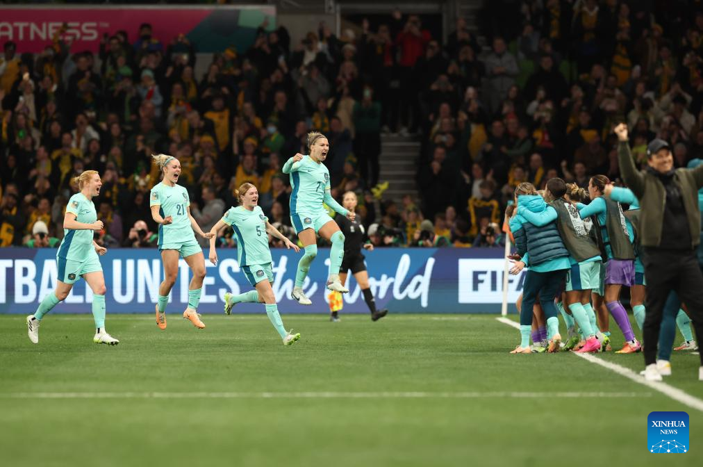 Players of Australia celebrate winning the Group B match between Canada and Australia at the 2023 FIFA Women's World Cup in Melbourne, Australia, July 31, 2023. (Xinhua/Ding Xu)