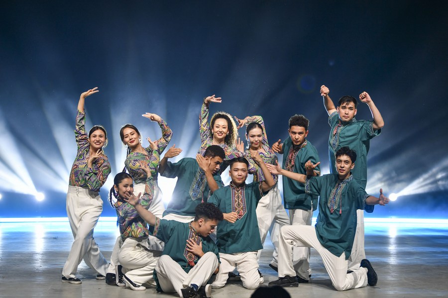 Dance troupe members from the Bunditpatanasilpa Institute of Thailand and members of the Muqam Art Troupe of Xinjiang Art Theater dance together at the Xinjiang Art Theater in Urumqi, northwest China's Xinjiang Uygur Autonomous Region, July 24, 2023. (Xinhua/Hu Huhu)