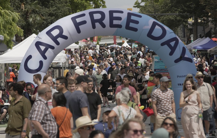 People walk on a street during the Car Free Day event in New Westminster, British Columbia, Canada, July 29, 2023. The second annual Car Free Day returned to New Westminster on Saturday, featuring live music, vendors, food trucks, and street performances. Blocks of streets were closed to vehicle traffic, creating a pedestrian-friendly environment aiming to promote a low-carbon lifestyle and community engagement. (Photo by Liang Sen/Xinhua)