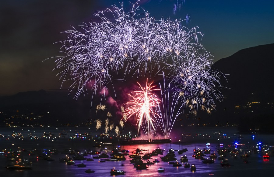 Fireworks presented by team Philippines light up the sky at English Bay in Vancouver, British Columbia, Canada, July 29, 2023. The fireworks show marked the final fireworks performance of the 31st Celebration of Light fireworks competition. (Photo by Liang Sen/Xinhua)■