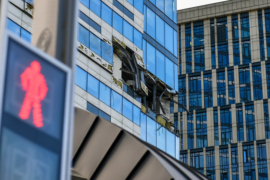 This photo taken on July 30, 2023 shows a building damaged in a drone attack in Moscow, Russia. Ukraine attempted to launch an attack on targets in Moscow with three drones but failed to achieve its goal, said the Russian Defense Ministry on Sunday. According to the ministry, Kiev launched three unmanned aerial vehicles at Moscow early morning on Sunday. One was shot down by air defense forces over the Odintsovo district in the Moscow region, while the other two were jammed by electronic warfare systems and crashed onto a complex of non-residential buildings in Moscow. (Xinhua/Cao Yang)