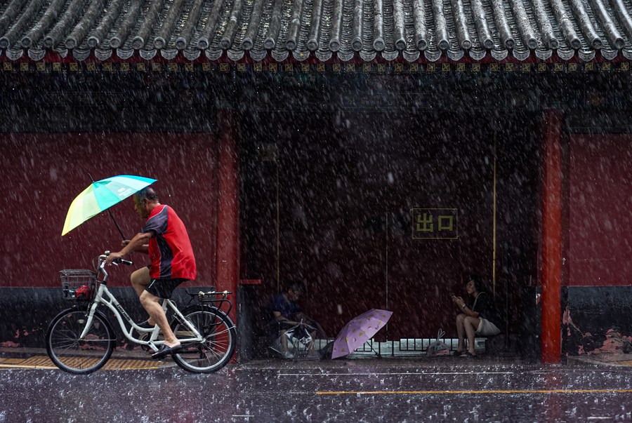 A man rides a bike amid the rain in Beijing, capital of China, July 30, 2023. Impacted by Typhoon Doksuri, the fifth typhoon of this year, heavy rainfall has hit north China regions, including Beijing, Hebei and Shandong. (Xinhua/Chen Zhonghao)