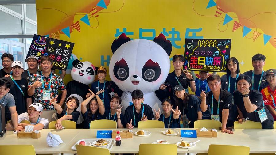 Water polo player Lee Sideok (Rear, 4th R) of South Korea and taekwondo player Park Hyejin (Rear, 6th R) of South Korea attend their birthday party at the dining centre in the 31st FISU Summer World University Games Village in Chengdu, southwest China's Sichuan Province, July 30, 2023. (Xinhua/Shen Bohan)