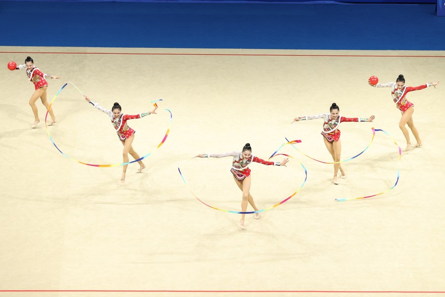 Team China compete during the Group All-Around Final Rotation 2 at the 31st FISU Summer World University Games in Chengdu, southwest China's Sichuan Province, July 30, 2023. (Xinhua/Zhang Liyun)