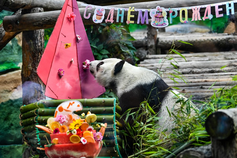 Giant panda Dingding is seen during her birthday celebration at the Moscow Zoo in Moscow, capital of Russia, July 30, 2023. Two giant pandas from China, Ruyi and Dingding, who have been living at the Moscow Zoo since 2019, enjoyed their birthday celebrations in Russia on Sunday. (Xinhua/Cao Yang)